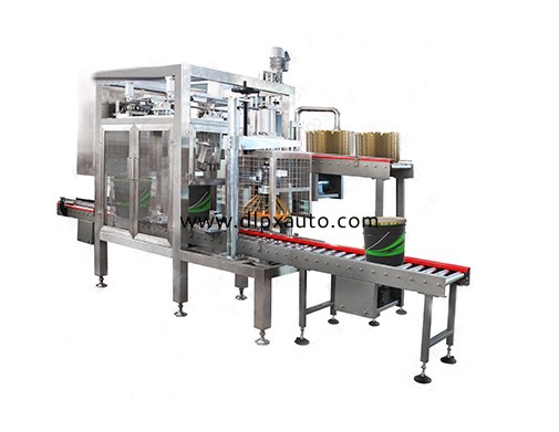 標準量涂料的桶,被準確送到自動理蓋機下,理蓋機通過機械手,每次吸取好一個桶蓋,準確放置到灌裝好涂料的桶上面,自動封口機會立即配合動作將桶蓋準確擠壓,對液體灌裝機灌好的涂料進行密閉封口。