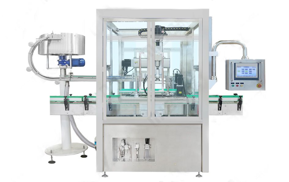 本機集進瓶、理蓋、上蓋、旋蓋、出瓶于一體。各傳動部件結(jié)構(gòu)先進,帶有離合報警裝置。整機智能控制,進、出瓶卡瓶時機器報警停機,缺蓋報警停機、有蓋自動復(fù)位啟動。在旋蓋過程中旋蓋效果緊密,優(yōu)良,無松蓋、歪蓋現(xiàn)象,旋蓋效率高。永磁離合器控制扭矩,扭力可調(diào)。定制化、個性化,客戶可按需選配自動充氮,不合格品自動剔除功能,可15分鐘內(nèi)快速換產(chǎn)。運轉(zhuǎn)平穩(wěn)、 噪音低、適用范圍大、與前后道灌裝,貼標(biāo)等設(shè)備易于聯(lián)線。