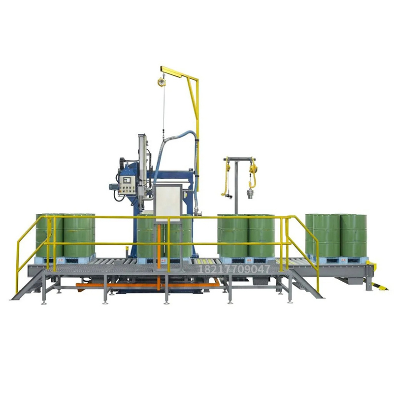 1. 四桶同時灌裝:設(shè)備配備了四個搖臂式灌裝頭,能夠同時對四個200升容器進(jìn)行灌裝操作,提高生產(chǎn)效率。