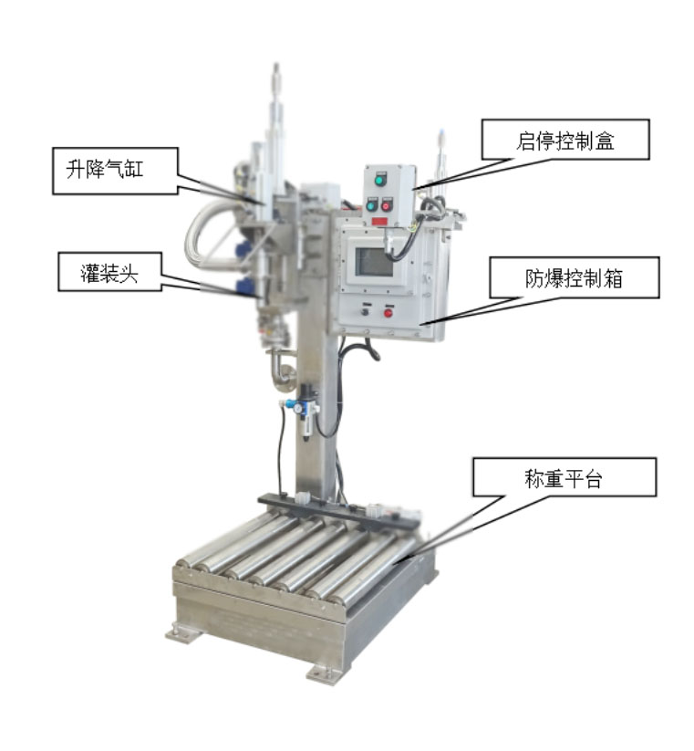 1.1、本機(jī)主要由防爆裝置、電控系統(tǒng)、光電檢測、稱重裝置、灌裝裝置等部分組成。