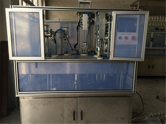 有輸送機將瓶子轉入灌裝位,自動灌裝,灌裝后再自動進入旋蓋,當瓶子轉到自動旋蓋過程中,瓶蓋有機械手夾子夾住瓶蓋,將瓶蓋送入瓶口上,