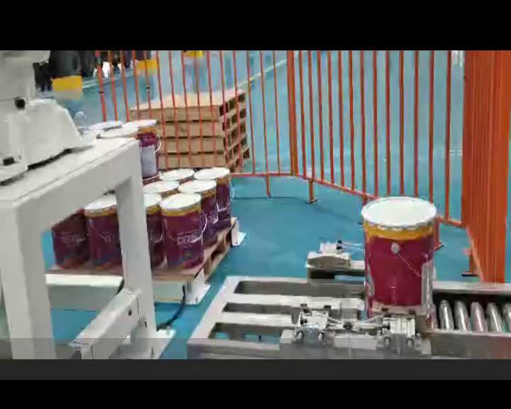 全自動(dòng)桶裝生產(chǎn)線:包括自動(dòng)臥式分桶、4頭自動(dòng)定量灌裝、自動(dòng)分蓋上蓋封口、機(jī)器人自動(dòng)碼垛整條全自動(dòng)生產(chǎn)線