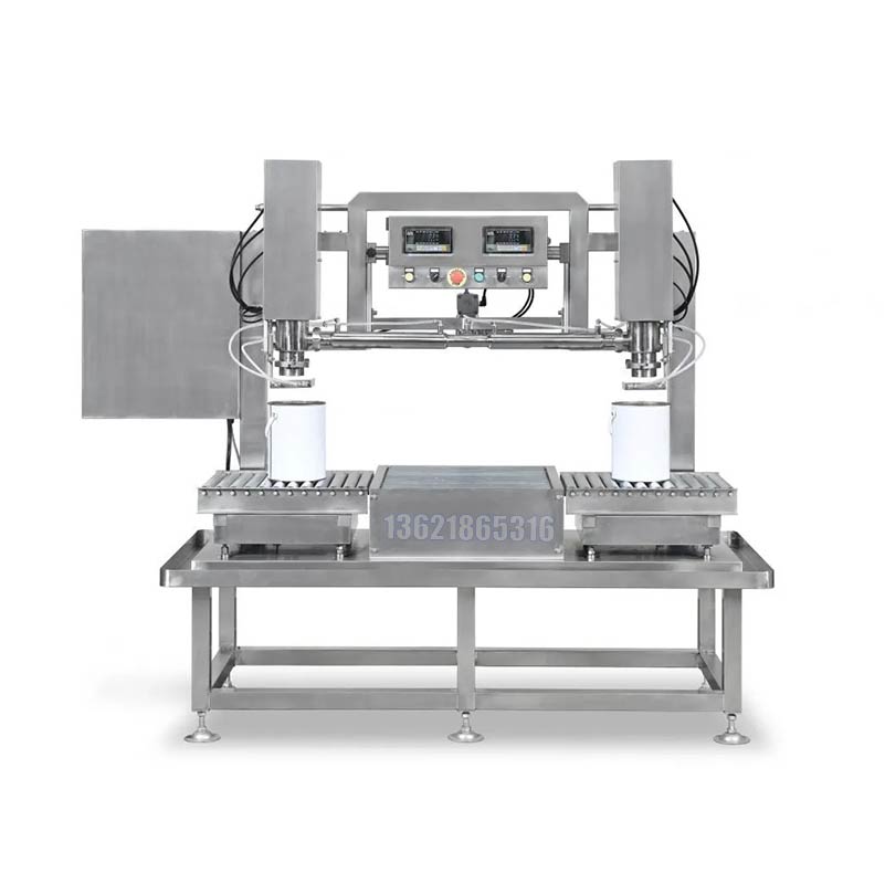 ■ 在灌裝系統(tǒng)的控制下,灌裝自動定位找到桶口,灌裝頭自動插入桶口,并將空桶自動去皮,系統(tǒng)打開球閥,進行大中小料三段式灌裝;