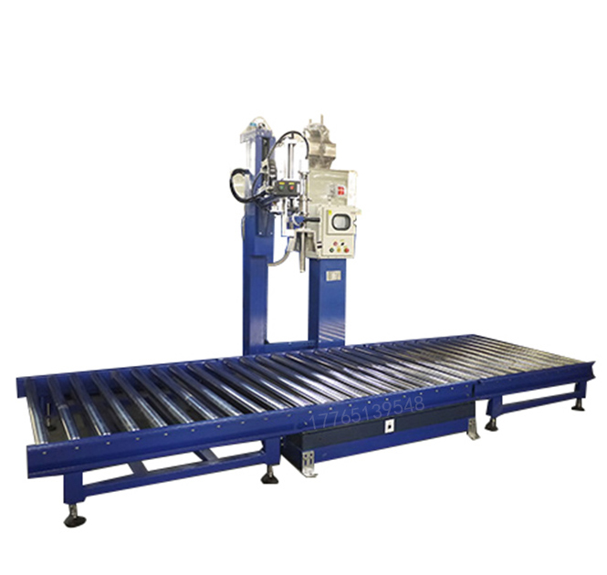 工作流程為:人工開蓋將空桶放在輸送線上,輸送線啟動(dòng),自動(dòng)輸送至灌裝工位,自動(dòng)對口自動(dòng)灌裝,首先進(jìn)入快速落料,到達(dá)一定重量(設(shè)定的小料重量)時(shí)轉(zhuǎn)換為慢速落料,當(dāng)重量到達(dá)目標(biāo)值時(shí)停止落料,計(jì)量完成即灌裝完成。當(dāng)灌裝完成后,自動(dòng)輸送至成品區(qū)人工鎖蓋,叉車移走成品桶,灌裝流程結(jié)束!