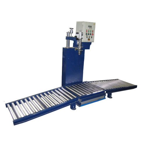 人工將空桶放到秤臺(tái)上,,然后點(diǎn)擊啟動(dòng)按鈕,儀表首先判桶并扣除空桶皮重,灌裝頭插入桶內(nèi)打開進(jìn)入快速落料,當(dāng)達(dá)到慢進(jìn)料設(shè)定重量時(shí),自動(dòng)轉(zhuǎn)為慢速落料。當(dāng)重量達(dá)到目標(biāo)值時(shí)停止落料,此時(shí)灌裝頭復(fù)位到初始位置,儀表回皮顯示總重,人工將空桶移出并索蓋,整個(gè)動(dòng)作流程結(jié)束。