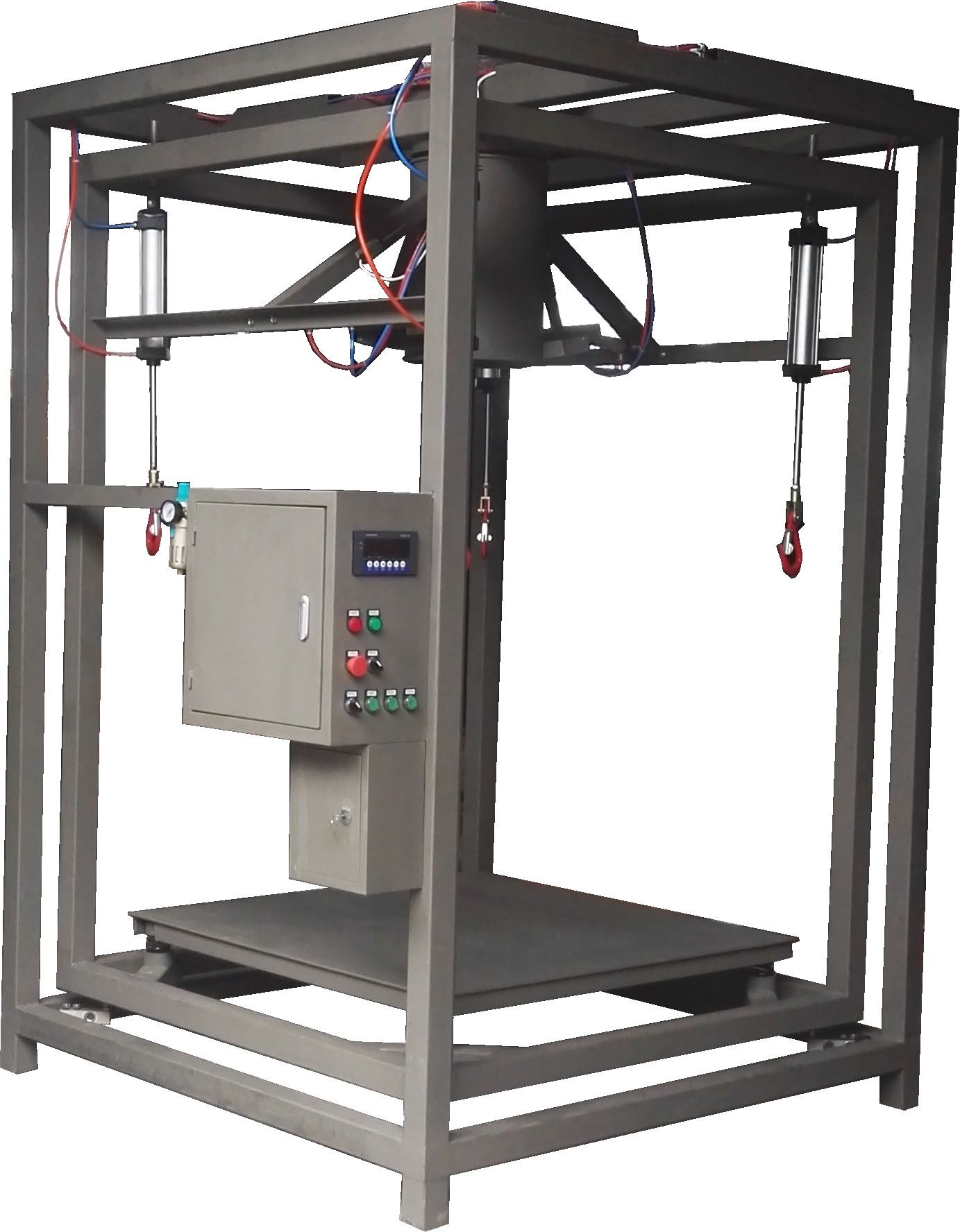 稱(chēng)重架與傳感器連接,將物料的重量信號(hào)傳遞給電器箱,由電器箱控制整臺(tái)機(jī)器的運(yùn)行。稱(chēng)重架上的升降氣缸勾住包裝袋角。