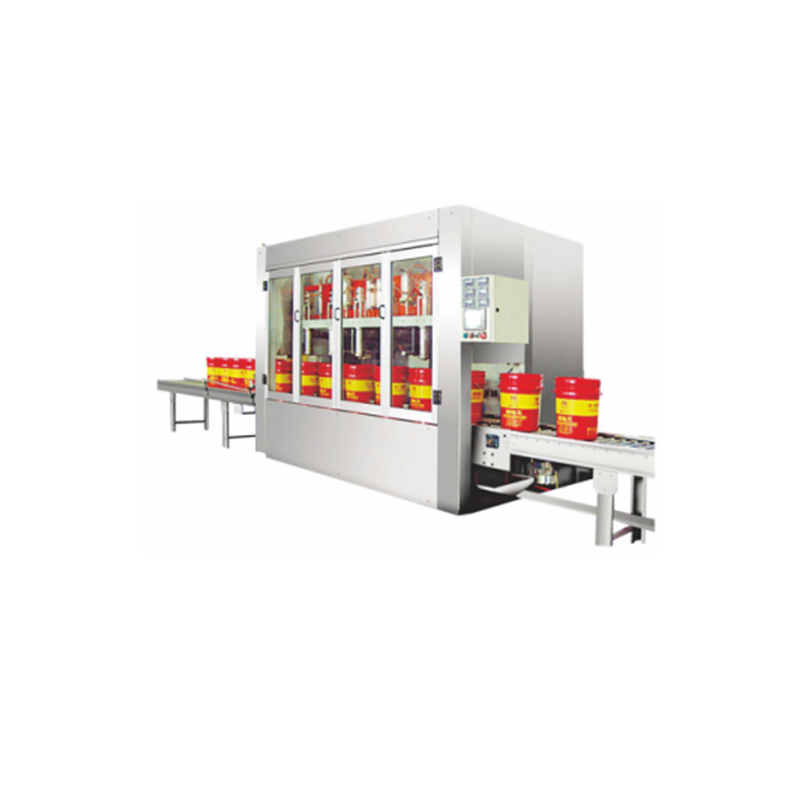 工作流程:空桶自動輸送 - 空桶撥至稱重區(qū)同時自動對桶口 - 空桶自動除皮 - 自動定量灌裝 - 自動推重桶至鏈板輸送線 - 自動上蓋同時自動鎖蓋 - 重桶輸送到重桶待提區(qū) - 人工提走即完成